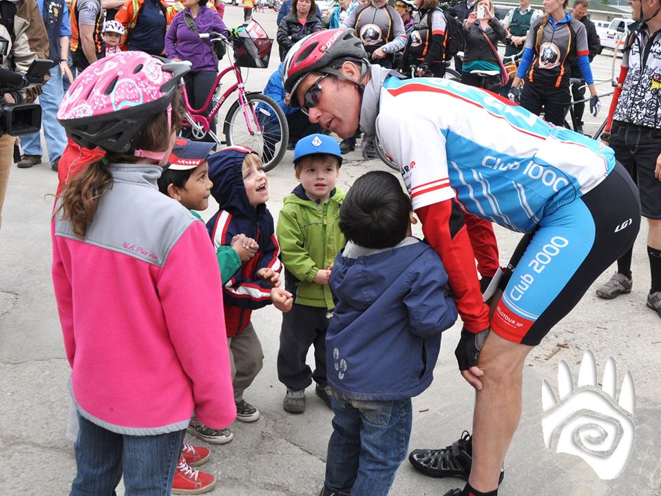 First stop was to the Ice-fields Center where I enjoyed a cup of coffee (4.25 cents) thanks to my friend Scott Wilson who just happened to be doing a concrete job there. I stopped at the Sunwapta Falls Resort and had a visit and some lunch courtesy of Stewart Heckley, I was still running early so took my time to the Goat Lick where I met Mike, Shirley and Andy and my camera man Dave, next thing the crew from Jasper Motorcycle Tours showed up to say hello and as it turned out to escort me back home. Next crew Libbie,George and Janka and my Ely Nevada friends the Lake Edith McLeans (wow) next we were joined by the Jasper Park Lodge Fire crew and Engine 4 then we began to pick up groups of my cycling friends, including the Rockhoppers MS Bike Team as well as two more JVBB fire trucks an ambulance and a couple of RCMP cars By the time we hit Highway 16 we must have had at least 50 cyclists etc. When we approached the Mile Zero cairn the Mayor Rich Ireland met me and congratulated me.