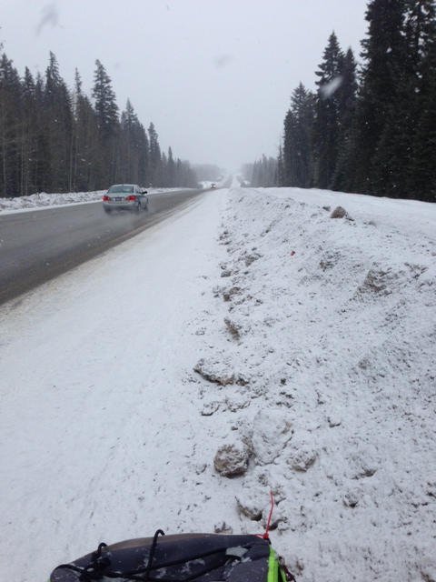 As I was descending the Terry Fox viewpoint hill I was passed by Jake Derksen who quickly turned around and pulled of in front of me, Jake refilled my water and ran along side me shouting encouragement as I began climbing the next hill. The snow fall increased and became wetter and as I got closer to the Robson Flats another vehicle pull off in front of me; this time it was Michael from the Three Ranges Brewing Company in Valemount, Michael was hoping I would have stopped in the day before to try out their ‘Angry Beaver’ IPA, but since I didn’t he tracked me down and handed me a growler, a glass and toque from Three Ranges; thank you Michael,(I will return).